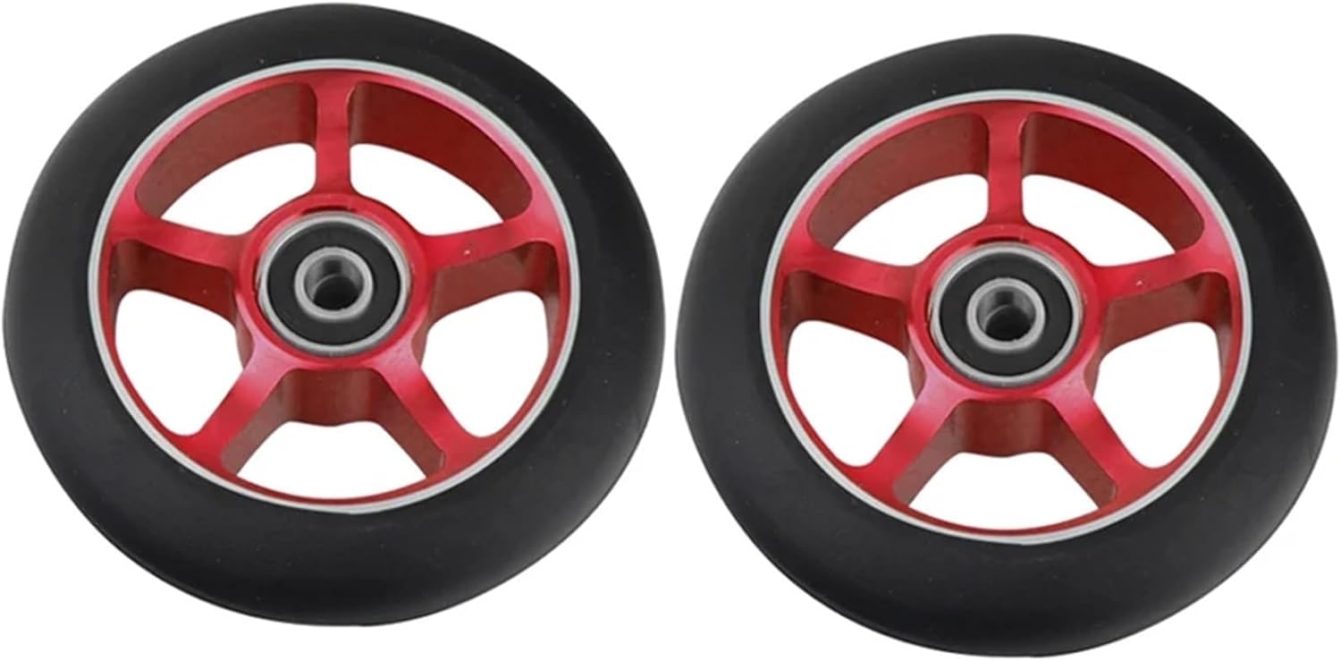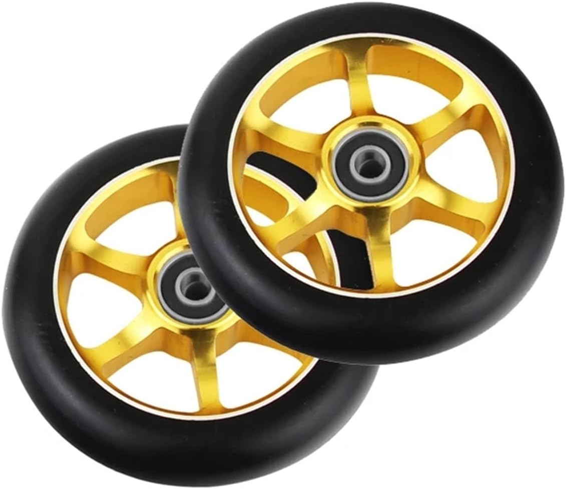 Whether you're a beginner or an experienced rider, our scooter wheels offer the perfect balance of strength and lightweight design to ensure optimal performance on any terrain.There is a common belief among riders that applying lubricants could prolong the lifespan of wheels. But this is not true since this actually often leads to early decay. Though most scooter wheels are sturdy, like every other machinery part, they wear over time and require replacement.Wheels have a very large impact on how your scooter feels and how fast your roll. We sell a large range of wheels that offer different speeds and grip. We offer them in 100mm and 110mm options.***made of CNC machined aluminum and strong high-rebound 88A PU(Polyurethane Material).***The diameter of the scooter wheel is 100mm(3.9inch) and the width 24mm(0.94inch). The wheels therefore fit on most stunt and freestyle scooters.***Package includes 2 scooter wheels and complete with our fast rolling and high precision ABEC-9 BearingsSpecification:Size: Diameter 100mm(3.9inch), width 24mm(0.94inch)Core: AluminumPU: High-rebound PolyurethaneHardness: 88A UrethanePackage: 2 x wheelType : WheelSize : Diameter 100mm(3.9inch), width 24mm(0.94inch)Features:Upgrade your ride with our stunt scooter replacement wheels! Designed for durability and speed, these hollow stunt scooter wheels are perfect for skateboard enthusiasts looking to enhance their stunts and tricks. Whether you're a beginner or an experienced rider, our scooter wheels offer the perfect balance of strength and lightweight design to ensure optimal performance on any terrain. Note:1. Due to manual measurement, please allow 1-5mm error. Make sure you don't mind before bidAding.2. Due to the difference of different monitors, the picture may not reflect the actual color of the product. Thanks.