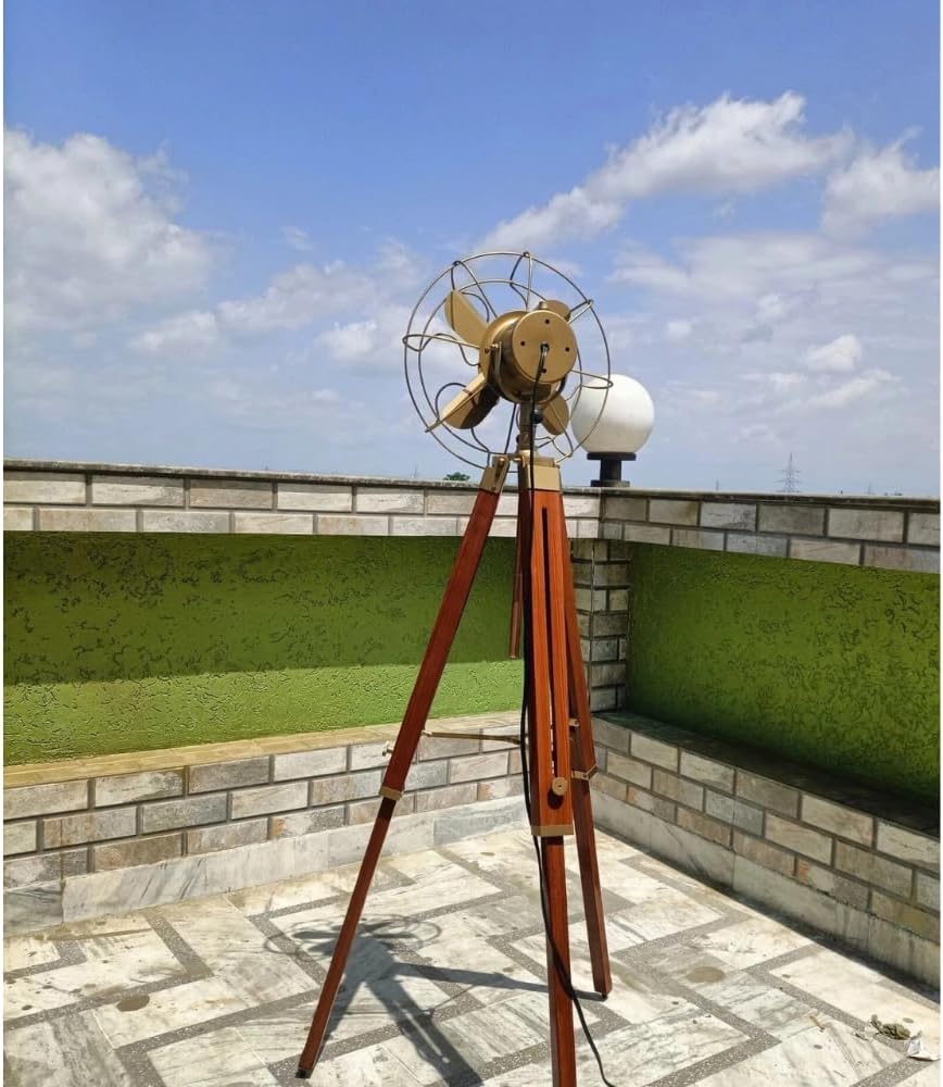 Add a stunning vintage accent to your living space with this industrial-style tripod floor fan. The elegant brass finish and classic design elements perfectly capture the essence of retro aesthetics while serving as a functional piece of decor. Mounted on a handsome wooden tripod stand with adjustable height, this fan combines form and function in a truly remarkable way. The distinctive four-blade design features a protective cage and smooth oscillating movement, reminiscent of classic early-century craftsmanship. The rich wooden tripod base provides stable support while adding warmth and character to the overall appearance. Whether placed in a living room corner, office space, or bedroom, this decorative fan makes a bold statement while providing practical airflow. The timeless appeal of this piece makes it an excellent choice for both traditional and contemporary interior settings, serving as both a conversation starter and a functional cooling solution.